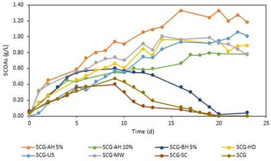 In general, the experimental results showed that the less harsh pretreatments (SCG-US, SCG-MW, and SCG-AC) seemed to result in a better substrate for AF. Even though the release of monomeric sugars and COD was lower, so too was the formation of inhibitors that seemed to have a negative impact on the AF process of SCGs, as could be observed for the other pretreatments. Mild conditions seemed to be enough to increase the accessibility and biodegradability of SCGs and resulted in high concentrations of SCOAs. The maximum SCOA concentration for SCG-US and SCG-MW of 1.06 on day 22 and 1.01 g/L on day 14, respectively, corresponded to an increase of 126 and 115% compared to the control. These techniques combined physical and thermal effects, and their use for waste pretreatment was already associated with an SCOA increases of up to 20 and 5 times for the US pretreatment of waste-activated sludge and MW pretreatment of beet pulp, respectively [60,61]. However, considering the results obtained for SCGs and the high energy demand and maintenance costs of these techniques, SCG-AH, at 5%, still stands as the most attractive option.