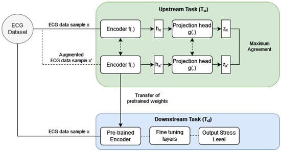 Contrastive SSL is a two-step training process that consists of an unsupervised pre-training upstream task () followed by a supervised downstream task (). In the , a neural network model is trained to learn a high-level representation of ECG data without depending on ground truth labels. Similar to the concept of transfer learning, in the following neural network weights from the are used as an initialization for training the model to predict stress from ECG data.