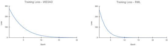 On the WESAD dataset, our upstream model is trained using the Adam optimizer with a learning rate of 0.0001 over 20 epochs. On the RML dataset, our upstream model is also trained using the Adam optimizer with a learning rate of 0.0001 over 25 epochs. The batch size used for upstream training on both datasets is 32. Similar to prior works such as [], the hyperparameters and model architecture for the upstream models were tuned based on the training set. The variety and combination of tuning parameters tested were based on empirical reasoning and a series of trial and error experiments. In particular, the learning rate, batch size, and training epochs were configured based on decreasing training loss. This is because the metric performance, i.e., accuracy, F1 score, etc., of the upstream model serves no purpose in stress detection. The purpose of the upstream model is to learn a high-level representation of the dataset is achieved based on the training performance. Figure 2 depicts the training loss of the upstream model for the WESAD and RML datasets, respectively. We see that the loss stabilizes well by the end of training. Furthermore, the upstream model was trained on the entire WESAD and RML dataset, respectively, for the WESAD and RML experiments. The use of the entire dataset for upstream training is seen in prior studies for self-supervised learning, for example, []. As the upstream model does not use any actual ground truth labels but rather trains on pseudo or automatically generated labels, bias due to repetition of data is not a major concern.