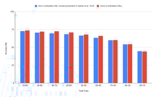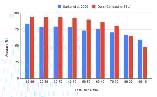 In [], a non-contrastive SSL model is proposed for emotion detection using ECG data. This model is pretrained on four publicly available affect-based datasets; AMIGOS, DREAMER, WESAD, and SWELL. When pretrained on the four datasets, it achieves an accuracy of 95% on the WESAD dataset. However, if only pretrained on the WESAD dataset, it achieves an accuracy of 86–87%. We recreate the experiments of [] and compare it with our model for the varying test–train ratios, as shown in Figure 4.