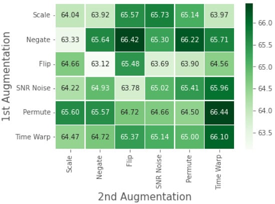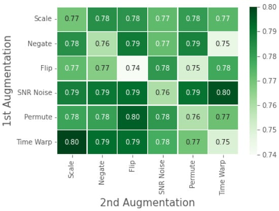 In Figure 5, we present the accuracy of our downstream model with varying configurations of augmentations used in the . We chose to perform the augmentation ablation study on the 70–30 split only, as it resulted in the maximum improvement from pre-training. Previous works such as [,] have performed this ablation study using linear evaluation of the downstream task using learned ECG representation from the upstream task. The left to right diagonal axis shows downstream results obtained from pre-training using a single augmentation, while the rest of the results correspond to pre-training with a composition of augmentations.
