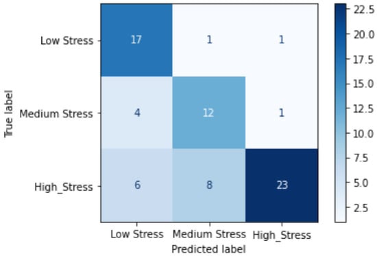 For the RML dataset, our proposed contrastive SSL model only uses the time-warping augmentation in the . The choice of this configuration and exception to using the composition of augmentations are explained further in later sections. It is pretrained on the entire RML dataset in the . The weights are then transferred to the where the model is fine-tuned for the three stress-level detection problems. We obtain an accuracy of 73.8% using a test-train split of 10–90. Furthermore, the confusion matrix in Figure 6 displays our models’ accuracy for predicting each class.