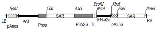 IFN-α2a gene expression construct.pTRA-PT, a derivative of pPAM (gi13508478) with a constitutive CaMV p35SS promoter and the 5′ UTR of the Tobacco Leader peptide (TL) was used for IFN-α2a expression in Raphanus sativus L. plants. RB/LB: right and left border sequences of nopaline-Ti-plasmid pTiT37. pAnos: polyadenylationsignal of nopaline synthetase gene derived from Agrobacterium tumefaciens. PAT: phosphinothricin acetyltransferase gene that confers resistance to BASTA (phosphinothricin). Pnos: nopaline synthase promoter of A. tumefaciens. IFN-α2a expression cassette is flanked by the 3′ UTR of CaMV (pA35S) and the scaffold attachment region (SAR) of the tobacco RB7 gene (gi3522871).