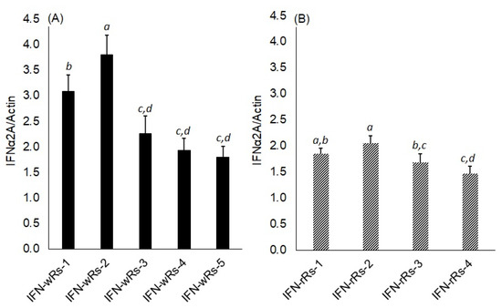 RT-PCR analysis of IFNα2a gene expression in transgenic white (A) and red (B) Raphanus sativus L. plants. IFN-α2a mRNA transcripts was measured by real-time qRT-PCR and calculated in arbitrary units compared to a standard dilution series. IFN-wRs 1-5: samples from five independent IFNα2a transgenic white Raphanus sativus L. plants, IFN-rRs 1-4: samples from four independent IFNα2a transgenic red Raphanus sativus L. plants. Data are represented as the average of at least three independent measurements of RNA preparations ± SE. Different small letters represent significant differences; p = 0.05.
