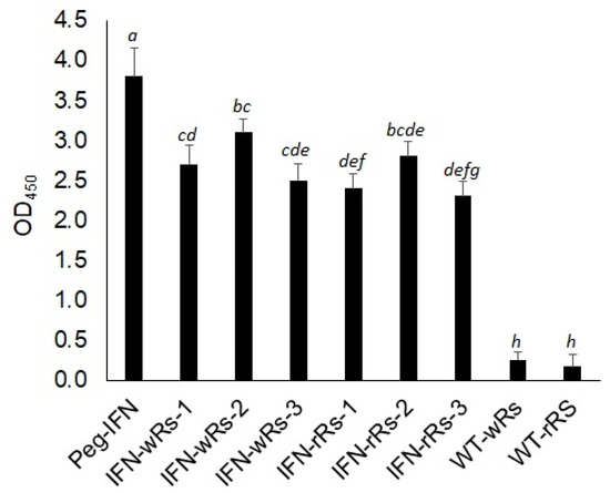 Enzyme-linked Immunosorbent Assay (ELISA) detection for IFN-α2a in wild-type and transgenic Raphanus sativus L. plants. Shown are OD450 values recorded for recombinant IFN-α2a samples and Peg-IFN (commercially available IFN-α (Pegasys®; Hoffmann-LaRoche, Basel, Switzerland)). IFN-wRs-1–3: total protein extracts isolated from three independent transgenic lines of IFN-α2a- transgenic white Raphanus sativus L. plants. IFN-rRs-1–3: total protein extracts isolated from three independent transgenic lines of IFN-α2a-transgenic red Raphanus sativus L., WT-wRs: wild-type white Raphanus sativus L. protein extracts. WT-rRs: wild-type red Raphanus sativus L. protein extracts. Data represent the average OD450 values recorded from at least 4 independent measurements ± SE. Different small letters represent significant differences; p = 0.01.
