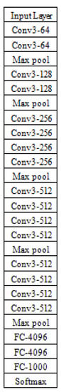 Figure 1 illustrates the architecture of VGG-19. The main idea addressed by this architecture is the possibility to increase the depth of a CNN model using too small convolutional filters of size 3 × 3 in every layer of the architecture. Five max-pooling layers exist to perform the spatial pooling process. Every max-pooling operation is performed using a 2 × 2 filter and a stride of 2. The convolution stride is always set to 1. It is clear from Figure 1 that there are 19 learnable layers, which are 16 convolutional layers and 3 fully connected layers. The numbering of filters starts at 64 and then increases by a factor of 2 along the depth of the network. The third fully connected layer has 1000 neurons as this network is designed based on the ILSVRC classification task [].