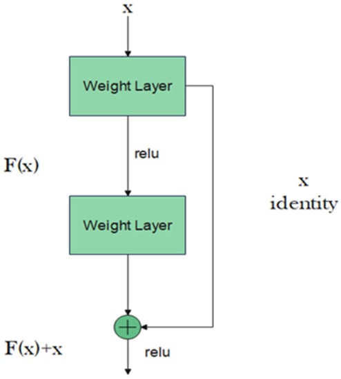 Residual neural network (ResNet) is another attempt to train deeper neural networks while achieving a high classification result. One could expect that a deeper network should perform at least equally to the performance achieved by its counterpart shallower network. However, this is not usually the case: the deeper the network, the more its training error increases. ResNet addresses this degradation in performance through the addition of residual blocks that employ the idea of shortcut connections as shown in Figure 2 [].