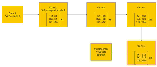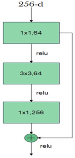 The residual block consists of two convolutional layers, in which the output of this block F(x) is added to the input x of this block via the shortcut connection. Simply, F(x) + x can be implemented easily using a feedforward neural network and shortcut connections that skip one or more stacked layers. The main purpose of the shortcut connections is that they perform identity mapping without adding any extra cost in terms of computational complexity and extra parameters. With the help of these residual blocks, a deeper model should have a training error no larger than that achieved through its shallower counterpart network. One variant of the residual block is introduced for deeper networks. This variant is a bottleneck design of the normal residual block. It consists of three convolutional layers: 1 × 1, 3 × 3, and 1 × 1 convolutions. The aim of this new variant is to decrease the number of feature maps for computational efficiency. Figure 3 represents this bottleneck design. ResNet-152 uses several three-layer blocks and its architecture is illustrated in Figure 4 [].