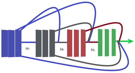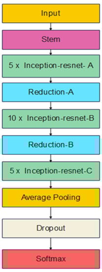 Szegedy et al. [] try to answer the question of whether to incorporate the residual connections with the inception architecture, mainly to improve the training process of the Inception network and to improve its classification performance. InceptionResNetV2 is one of the solutions to this question. As Inception architecture is very deep, residual connections replaces the filter concatenation stage of the Inception architecture. The results show that a significant improvement in the classification performance is achieved by this new hybrid model. Figure 5 illustrates an abstract view of the InceptionResNetV2 architecture. A detailed view for every block of Figure 5 is available in [].