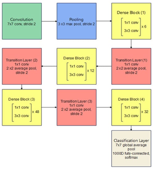 In an ordinary CNN with n layers, every layer is connected to the layer after it, which results in n connections. However, in a dense convolutional network (DenseNet) the feature maps of a given layer are connected to all consecutive layers and all the previous feature maps from this layer are connected to this given layer, resulting in (n(n + 1))/2 connections instead. This leads to many benefits including the need for fewer model parameters as compared with ordinary CNNs, enhancing feature propagation and supporting feature reuse. Additionally, it leads to the obtainment of a regularization effect due to the dense connections, which reduce overfitting with smaller training dataset sizes and a good solution to the famous vanishing gradient problem. Hence, the model is easy to be trained. Figure 6 illustrates a dense block with three layers, in which each layer takes all previous feature maps as inputs. It is important to mention that the connected layers should have identical feature-map sizes and the connection is achieved through concatenation instead of summation that is used in residual blocks. Figure 7 presents the architecture of a DenseNet-201 model [].