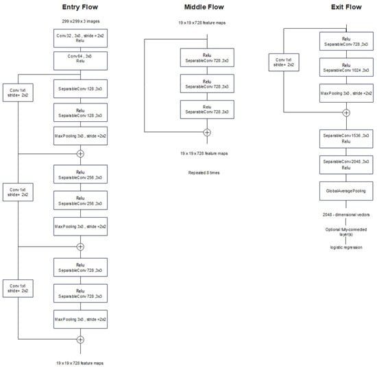 In fact, the Xception model can be considered as a linear stack of depthwise separable convolution layers plus residual connections. Figure 8 demonstrates the architecture of the Xception model. This architecture consists of 36 convolutional layers arranged in 14 modules with residual connections, except for the first and last modules. Every convolution and separable convolution layer is followed by batch normalization (not shown in Figure 8) [].