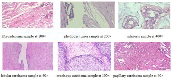 The dataset is divided into 5536 images for the training set, 1580 for the validation set, and 793 images for the test set. This division is selected to be as near as possible to the 70% training, 20% validation, and 10% test splitting ratio. For the magnification-independent experiments, all images are considered irrespective of their magnification factors. They are divided into two classes, which are benign and malignant for the binary classification experiment. On the other hand, these images are divided into eight classes, which are adenosis (A), tubular adenoma (TA), phyllodes tumor (PT), fibroadenoma (F), papillary carcinoma (PC), lobular carcinoma (LC), ductal carcinoma (DC) and mucinous carcinoma (MC) for the multi-class classification experiments. Meanwhile, for the magnification-dependent experiments, the images are selected from each magnification factor and then divided into two classes for binary classification. Then, the same images are divided into eight classes for the multi-class classification experiments. Hence, for magnification-dependent experiments, eight datasets are formed in total (four datasets represent each magnification factor for binary classification and another four datasets for the multi-class classification experiments). For the magnification-independent experiments, two datasets are formed (one for the binary classification and one for the multi-class classification). Each dataset formed is divided into a training set, a validation set, and a test set. Moreover, images in BreakHis dataset are randomly shuffled before forming the datasets to break any possible bias. Table 3 illustrates the exact distribution of images in the training, validation, and test datasets. Figure 9 shows a sample of the images from the BreakHis dataset.