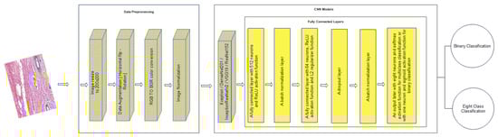 The input images are first resized to 200 × 200 pixels to increase the computational efficiency and reduce the training time. Moreover, since the number of images in the BreakHis dataset is limited, the problem of overfitting can occur []. One approach to avoid overfitting is to use data augmentation techniques [,]. However, one should carefully select the appropriate data augmentation technique when dealing with medical images. This is attributed to the fact that inappropriate manipulation of essential features can eventually be destructive to the model performance []. Only rotation and horizontal flip augmentation techniques are used. Images are rotated randomly with a maximum rotation angle of 180°. The data augmentation used in this study is applied to augment the training input images so that the model never sees the exact same image twice during training process. After the input image is augmented, its color map is changed from RGB to BGR. Then, the input image is normalized. This is mainly needed because when the learning model is fed with input data values that are greatly wide in range, it can make the learning process very difficult, and hence, normalization of the input data is adopted. One method to normalize the input data is to subtract the mean from each data item and divide by the standard deviation. These statistics can be calculated either per the input image or per the dataset []. In this paper, the mean and the standard deviation are calculated from the training dataset only, and every input image x is then normalized using (1).