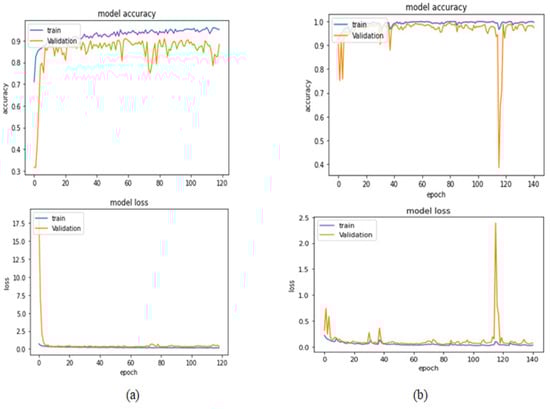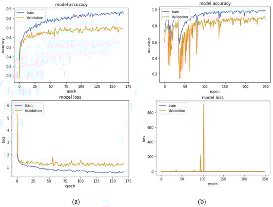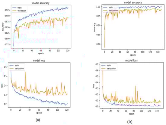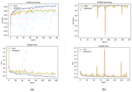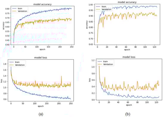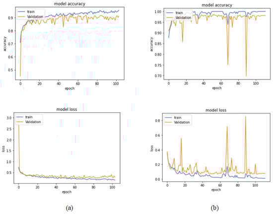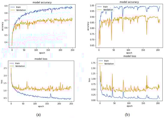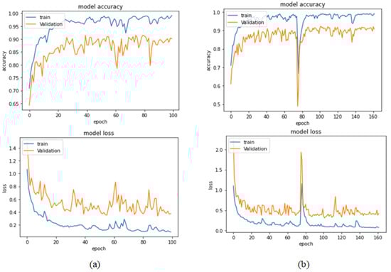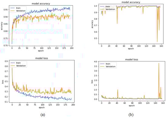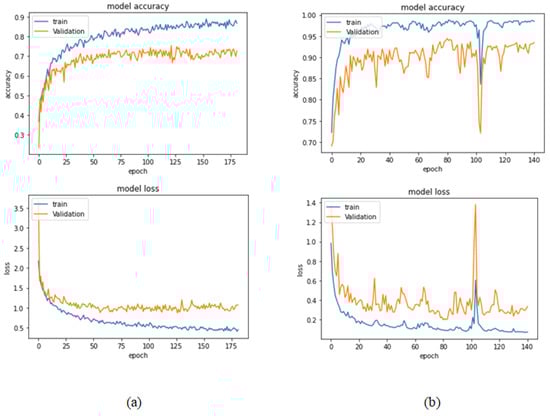 Learning curves for Xception at 0.0001 learning rate in 200× magnification-dependent multi-classification. (a) Accuracy and loss curves of Phase 1 of training. (b) Accuracy and loss curves of Phase 2 of training.