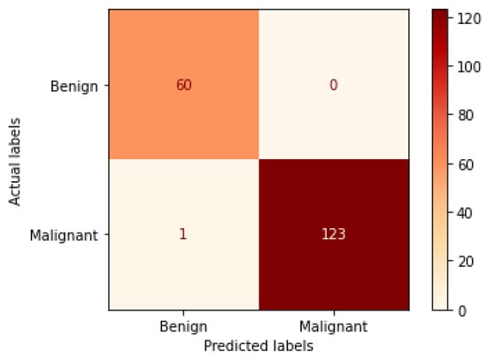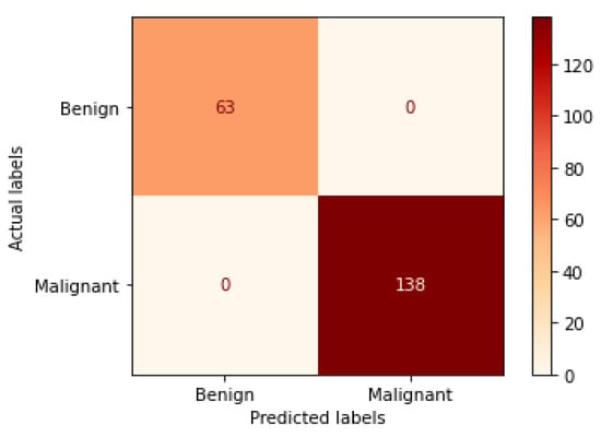 Table 10 represents the results obtained using the test set for the 40× magnification factor. The best model obtained in this experiment is the Xception model at a learning rate of 0.0001. VGG19 also achieves the best results at a learning rate of 0.00001. The least performance is achieved by ResNet152 model at a learning rate of 0.0001. Figure 23 and Figure 24 illustrate the learning curves and confusion matrix for the Xception model. For Phase 1 of the training process, the best model obtained for Xception achieves a validation accuracy of 75.38% at epoch 122 and the learning process stops early at epoch 182 due to there being no improvement in the validation accuracy for 60 epochs. For Phase 2, the Xception model achieves a validation accuracy of 94.47%, which is still in synchronization with the test accuracy achieved afterwards (i.e., 97.01%). This validation accuracy is achieved at epoch 81, and the training process stops early at epoch 141.