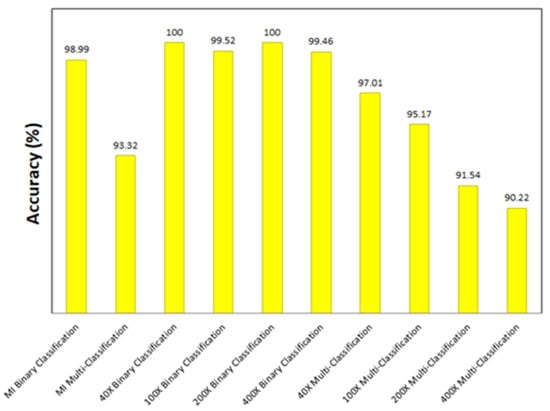 It is clear from the results that the Xception model (with a learning rate of 0.0001) achieves the highest classification accuracies in all the experiments. Figure 31 shows the accuracy achieved by the Xception model for each experiment. In addition to Xception, other models perform considerably well. Few examples can be stated in this section to prove this point. In the magnification-independent binary classification experiment, it can be noted that the performance of DenseNet201 at a learning rate of 0.0001 is absolutely comparable to the performance of Xception with a difference of 0.38% in terms of accuracy between the two models. In the same experiment with a learning rate of 0.0001, Inception ResNet V2 is only 0.5% less accurate than Xception. In the 40× binary classification experiment, the comparability of the results is even more evident, in which DenseNet201 and VGG19 at a learning rate of 0.00001 achieve the exact results of Xception at a learning rate of 0.0001. Moreover, the results of 100× binary classification exhibit that DenseNet201 at a learning rate of 0.00001 performs in the same manner as Xception. Thus, the main objectives of the study have been achieved by attaining the most-efficient model as the best performing model in all the experiments and other models that can achieve similar efficacy in specific scenarios.
