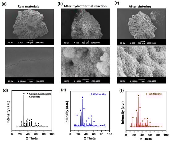 Surface morphology of marine-plankton-derived WH bone granules: (a) SEM images of the raw material, (b) material after the hydrothermal reaction, and (c) material after the sintering process. Characterization of the granules according to the process using XRD for the (d) raw material, (e) material after the hydrothermal reaction, and (f) material after the sintering process.