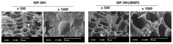BMP2 was incorporated into MP-WH bone granules by absorbing the BMP2 solution, and a lyophilizing method was used. There was no significant change in the porous structure following BMP2 incorporation. In addition, the surface of the bone graft material to which the BMP2 was adsorbed did not change significantly, but the agglomerated lyophilized pellets were rarely observed on the surface (Figure 2).