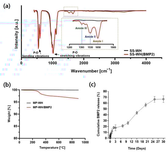 Physicochemical characterization of BMP2-coated MP-WH granules: (a) FT-IR spectra of BMP2-incorporating MP-WH granules, (b) TGA of BMP2-coated MP-WH granules, and (c) cumulative release of BMP2 from MP-WH/BMP2 granules for 30 days. The supernatant is collected at specific time points and the concentration is detected using the ELISA method. The reported values are means ± SD.