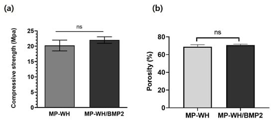 Measurements of the granules’ mechanical strength and porosity: (a) compressive strength and (b) porosity of the synthesized MP-WH and MP-WH/BMP2 granules. Data are means ± standard deviation (SD) over three samples. “ns” indicates significant differences, compared with the uncoated three-dimensional scaffolds (p < 0.01).