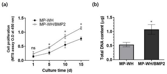 To assess cell proliferation, an MTS assay was performed at predetermined time points (1, 5, 10, and 15 days). Briefly, at each time point after culturing, the cell growth medium was removed, following which the cell-cultured granules were rinsed using PBS. A fresh culture medium (200 μL) and MTS reagent were mixed and added to each well. After incubation at 37 °C for 2 h, the resultant supernatant was collected and the absorbance was measured at 450 nm using a microplate reader (SpectraMAX M3; Molecular Devices, Sunnyvale, CA, USA). To confirm cell proliferation, the total amount of deoxyribonucleic acid (DNA) was quantified using the PicoGreen assay (Molecular Probes, Eugene, OR, USA) after five days of cultivation. Briefly, the total amount of DNA was extracted from the hMSC-cultured MP-WH and MP-WH/BMP2 granules. The DNA solution (100 µL) was mixed with a DNA-binding fluorescent dye solution (0.5 µL PicoGreen reagent), and the fluorescence intensity was measured at excitation (490 nm) and emission (520 nm) wavelengths.