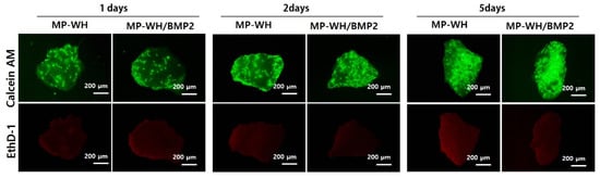 To evaluate the cell cytotoxicity, viability/cytotoxicity kits (Invitrogen, Carlsbad, CA, USA) were used. Briefly, after 1, 2, and 5 days, the cells cultured on the MP-WH and MP-WH/BMP2 granules were rinsed with PBS. The cells were stained using the kit solutions (Calcein AM and EthD-1) and were observed under an inverted fluorescence microscope (DM IL LED Fluo; Leica Microsystems, Wentzler, Germany).