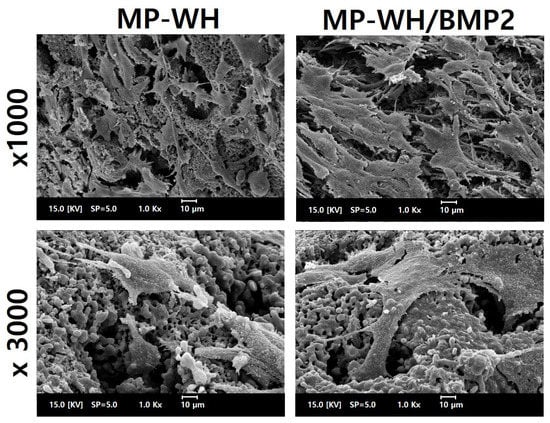 SEM analysis was performed to observe the adhesion of cells to the surface of the bone graft material. On the MP-WH surface, hMSCs grew and adhered, while maintaining their typical fibroblastic morphology. In addition, under high magnification, these cells were observed to grow and enter the pore structure of the MP-WH granules. The cells that were cultured on the MP-WH/BMP2 granules grew well, maintaining their typical fibroblast morphology. High-magnification observations revealed that the cells flexibly bent inward along the pore structure and attached. However, comparing these two observations, the cells grown on the MP-WH/BMP2 granules had a higher cell density than those grown on the MP-WH granules, and growth of overlapping cell layers was observed (Figure 7).