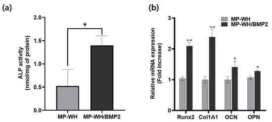 To evaluate the effect of BMP2 incorporation on osteoblast differentiation, the ALP activity and osteoblast differentiation marker gene expression were evaluated using RT-PCR. After a 7-day-long cultivation period, the ALP activity for the MP-WH/BMP2 grown cells was significantly (~3 fold) higher than that for the MP-WH-grown cells (Figure 8a). Furthermore, qRT-PCR analysis revealed the mRNA levels of Runx2 (~2.1 fold), Col1A1 (~1.4 fold), OCN (~1.2 fold), and OPN (~1.2 fold); the mRNA levels were significantly higher for the MP-WH/BMP2-cultured cells (Figure 8b).