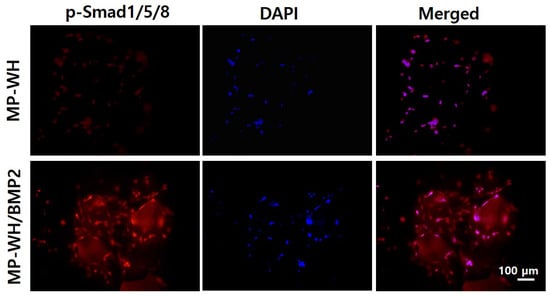 Activation of MP-WH/BMP2-induced pSmad 1/5/8 signaling: hMSCs cultured on MP-WH and MP-WH/BMP2 granules, and Smad 1/5/8 phosphorylation detected by immunofluorescence staining via DAPI (blue) and anti-pSmad 1/5/8 (red).