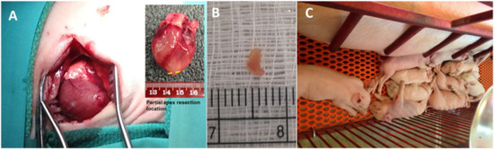 (A) Partial apex resection surgery performed on neonatal piglets. Inserted image schematically shows the partial apex resection location. (B) Heart muscle tissue resected from the apex of a piglet heart. (C) Piglets resting with mother sow after surgery.
