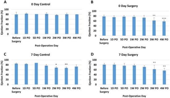 Average ejection fraction (percentage) at different time points for each group. (A) Zero-day control group. (B) Zero-day surgery group. (C) seven-day control group. (D) seven-day surgery group. *, **, and *** represent a significant difference (p < 0.05) between before surgery and the labeled time point.