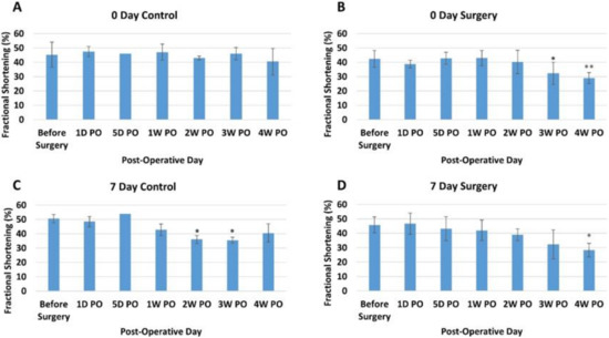 Average fractional shortening (percentage) at different time points for each group. (A) Zero-day control group. (B) Zero-day surgery group. (C) Seven-day control group. (D) Seven-day surgery group. * and ** represent a significant difference (p < 0.05) between before surgery and the labeled time point.