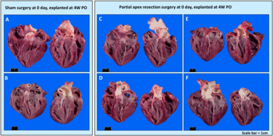 Gross anatomy photos. (A) Zero-day control (sham) heart from piglet #2033. (B) Zero-day control (sham) heart from piglet #2038. (C) Zero-day surgery heart from piglet #2034. (D) Zero-day surgery heart from piglet #2035. (E) Zero-day surgery heart from piglet #2036. (F) Zero-day surgery heart from piglet #2037. Scale bar = 1 cm.