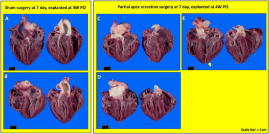 The animal experiment protocol was approved by the Mississippi State University Institutional Animal Care and Use Committee (IACUC, #15-045) and was performed in accordance with the National Institutes of Health (NIH, Bethesda, MD, USA) guidelines. For this study, we utilized 36 piglets that were delivered by three mother sows (Yorkshire), which were divided into two study groups, i.e., 0-day-old group (<24 h, N = 17) and seven-day-old group (N = 19) (Table 1 and Supplementary Materials). We chose 0-day and 7-day as two major time points in order to compare with the mouse apex resection study [35]. Each age group was further categorized as the apex removal group (N = 28 total, < 24-h N = 13, 7-day N = 15) and the control group (N = 8 total, <24-h N = 4, 7-day N = 4) (Table 1). In the apex removal group, each piglet was subjected to a thoracotomy and pericardiotomy followed by a partial thickness apical resection. In the control group, the piglets only experienced a thoracotomy and a pericardiotomy (sham surgery). The assignment of groups was randomly implemented. The piglets in both 0-day and seven-day groups were euthanized and necropsied at five days, one week, or four weeks post-operatively (Table 1).