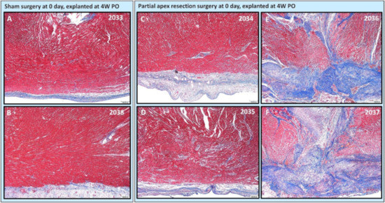 Partial apex resection surgery at 0 days and heart explanted at 4W PO-Masson’s Trichrome histology of 0-day control hearts and 0-day surgery hearts. Heart explants were obtained four weeks post-operation (4W PO). (A) Zero-day control (sham) heart from piglet #2033. (B) Zero-day control (sham) heart from piglet #2038. (C) Zero-day surgery heart from piglet #2034. (D) Zero-day surgery heart from piglet #2035. (E) Zero-day surgery heart from piglet #2036. (F) Zero-day surgery heart from piglet #2037. Histological images were taken at 4× magnification (Scale bar = 200 μm). Masson’s Trichrome: red–muscle; blue–collagen.