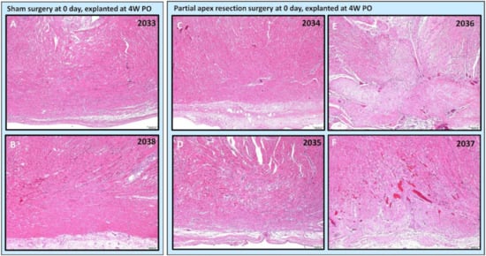 The other two piglets (#2036 and #2037; Figure 6E,F) in the 0-day surgery group had a population of proliferative cells that had variable extension into the myocardium and dissection into adjacent cardiac myofibers at 4× magnification. These cells are reminiscent of cardiomyocytes in H & E-stained images (#2036 and #2037; Figure 7E,F), but are associated with abundant extracellular collagenous matrix based on Masson’s trichrome stained images (Figure 6E,F). These images suggest a partial regeneration of the resected apex tissue (#2036 and #2037; Figure 6E,F and Figure 7E,F).