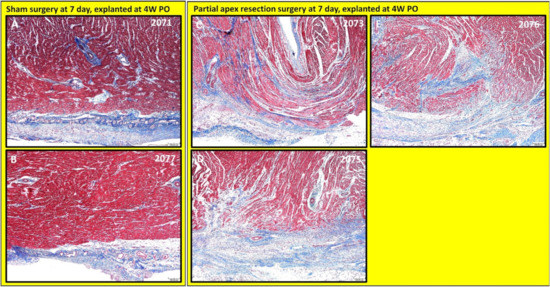 Our histological study provides a solid observation of the tissue remodeling process after the introduction of the injury. From histological images of the heart explanted at 4W PO, we further noticed that two of the 0-day apex resection group animals (#2034 and #2035), with resected apical mass similar to the average resected mass of the seven-day surgery group (Table 2), had only subtle deviation at the resection area from the surrounding myocardium (Figure 6C,D #2034 and 2035). When compared to the control hearts, these piglets had largely imperceptible changes, including slight disorganization, a slightly higher number of cells, and vascular prominence in the absence of an increased extracellular collagenous matrix. The other piglets in this group, which had a much larger resected apex mass (#2036 and #2037) (Table 2), showed a population of proliferative cells dissecting into adjacent myocardial fibers (Figure 6E,F #2036, #2037). Those cells were reminiscent of cardiomyocytes but were associated with the ECM. However, all piglets in the seven-day-old surgery group, independent of the resected apical mass (Table 2), were found to have moderate to severe fibrosis in the epicardial region as well as the interstitial myocardium (Figure 8C–E). This fibrosis was associated with the excess extracellular collagenous matrix compared to the control piglets in the seven-day group, indicating scar formation. We could hence conclude that the observed differences in regeneration potential were not caused by variations of resected apical mass.
