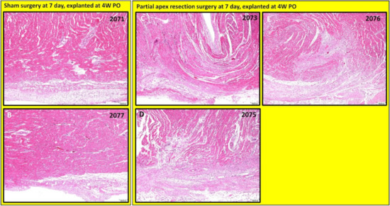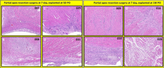 Partial apex resection surgery at seven days and heart explants at 5D PO and 1W PO-Hematoxylin and Eosin (H & E) histology of seven-day surgery heart explants obtained five days post-operation (5D PO): (A) Seven-day surgery heart from piglet #007. (B) Seven-day surgery heart from piglet #008. (C) Seven-day surgery heart from piglet #029. (D) Seven-day surgery heart from piglet #031. H & E histology of seven-day surgery heart explants obtained one-week post-operation (1W PO): (E) Seven-day surgery heart from piglet #009. (F) Seven-day surgery heart from piglet #010. (G) Seven-day surgery heart from piglet #016. (H) Seven-day surgery heart from piglet #028. Histological images were taken at 4× magnification (Scale bar = 200 μm). H & E: pink–cytoplasm; blue–nuclei; intense red–erythrocytes.