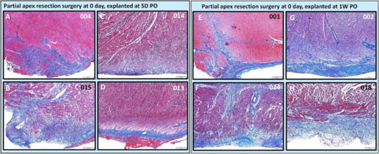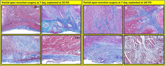 Partial apex resection surgery at seven days and heart explants at 5D PO and 1W PO-Masson’s Trichrome histology of seven-day surgery heart explants obtained five days post-operation (5D PO): (A) Seven-day surgery heart from piglet #007. (B) Seven-day surgery heart from piglet #008. (C) Seven-day surgery heart from piglet #029. (D) Seven-day surgery heart from piglet #031. Masson’s Trichrome histology of seven-day surgery heart explants obtained one week post-operation (1W PO): (E) Seven-day surgery heart from piglet #009. (F) Seven-day surgery heart from piglet #010. (G) Seven-day surgery heart from piglet #016. (H) Seven-day surgery heart from piglet #028. Histological images were taken at 4× magnification (Scale bar = 200 μm). Masson’s Trichrome: red–muscle; blue–collagen.