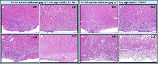 Partial apex resection surgery at 0 day and heart explants at 5D PO and 1W PO-Hematoxylin and Eosin (H & E) histology of 0-day surgery heart explants obtained five days post-operation (5D PO): (A) Zero-day surgery heart from piglet #004. (B) Zero-day surgery heart from piglet #015. (C) Zero-day surgery heart from piglet #014. (D) Zero-day surgery heart from piglet #013. H & E histology of 0-day surgery heart explants obtained one-week post-operation (1W PO): (E) Zero-day surgery heart from piglet #001. (F) Zero-day surgery heart from piglet #024. (G) Zero-day surgery heart from piglet #002. (H) Zero-day surgery heart from piglet #018. Histological images were taken at 4× magnification (Scale bar = 200 μm). H & E: pink–cytoplasm; blue–nuclei; intense red–erythrocytes.