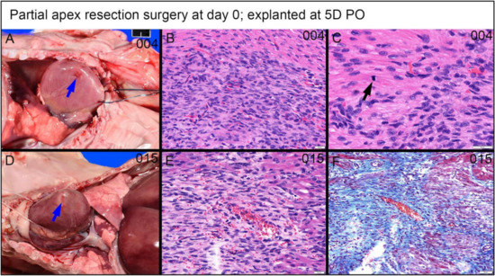 Partial apex resection surgery at 0 days and heart explants at 5D PO and 1W PO. Of the 0-day piglets euthanized 5D PO, Pig 004 and 015 (Figure 10A,B, Figure 11A,B, and Figure 12B,C,E,F) both have a focus of densely proliferative cells extending deeply into the myocardium, consistent with the progression of tissue regeneration or repair. In piglet #004, these cells have plump elongate nuclei and occur in streaming arrays in parallel with adjacent myocardium (Figure 12B). Mitotic figures in cells morphologically identifiable as cardiomyocytes occur in the marginal zone of proliferative cells (Figure 12C, arrow). Coexisting with these mesenchymal cells, the matrix is stained predominately with collagen. Piglet 014 (Figure 10C and Figure 11C) has a shallow focus of mesenchymal cells, including a small amount of ECM. Piglet 013 (Figure 10D and Figure 11D), unlike the other piglets, exhibited signs of epicardial fibrosis that appears as reactive fibrovascular tissue organizing superficial epicardial fibrin.