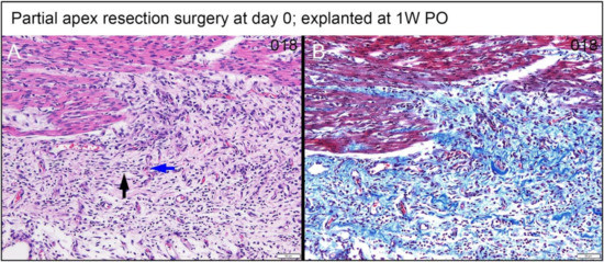Partial apex resection surgery at 0 days and heart explanted at 1W PO-(A) Hematoxylin and Eosin (H & E) histology 0-day surgery heart explant obtained one week post-operation (1W PO) from piglet #018. Higher magnification of the field of Figure 11H reveals proliferative spindle cells with thin nuclei often oriented in stacked arrays (black arrow) that are perpendicular to capillaries (blue arrow) typical of fibrovascular tissue. The relationship to the myocardium is abrupt. (B) Masson’s Trichrome of the same field reveals prominent interspersed collagen (Scale bar = 50 μm).