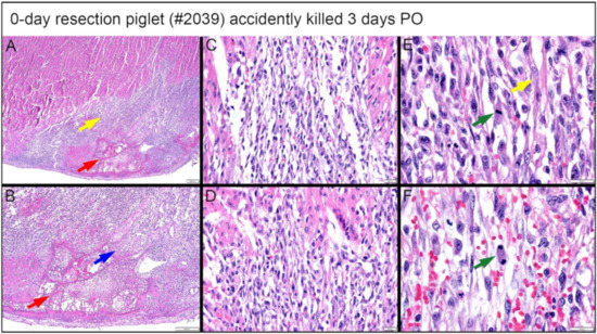 A piglet (#2039; Figure 16) from the 0-day surgery group was briefly lain on and accidentally killed by the mother sow three days PO. Subsequent to rapid discovery, the piglet was necropsied in fresh condition. Note that the following observed proliferate cells and repairing events at the lesion site are not immediate changes that are caused by suffocation. Upon histological evaluation, the piglet demonstrated a zone of fibrin and hemorrhage at the apex resection site, shown at 2× magnification in Figure 16A. At the apex resection site, the proliferative mesenchymal cells extend into fibrin (red arrow in Figure 16B at 4× magnification) as well as into a narrow focus of necrotic cardiomyocytes (blue arrow in Figure 16B at 4× magnification). The fibrin and hemorrhage zone was bordered by a dense cellular population of streaming mesenchymal cells that formed a wide margin blending into and insinuating in and amongst existing cardiomyocytes (fibrin zone shown with a red arrow, border zone shown with yellow arrow in Figure 16A). From the 20× magnification images, these cells formed streaming, somewhat fascicular arrays of spindyloid cells with large, plump, variably sized, ovoid to elongated nuclei, and multiple prominent nucleoli (Figure 16C,D). At 40× magnification, mitotic events, where cell division is actively ongoing, were easily identified (green arrows in Figure 16E,F), and coexisting nuclei had fine chromatin and large prominent nucleoli. Some interspersed cells in this proliferative population with similar nuclei had slender strands of cytoplasm with the suggestion of cross striations, resembling immature cardiomyocytes (yellow arrow in Figure 16E).