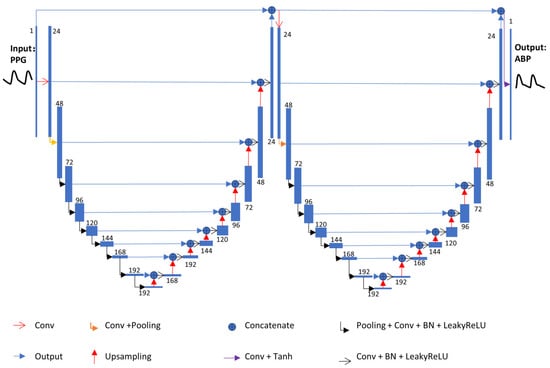 - Ibtehaz, N.; Rahman, M.S. Ppg2abp: Translating Photoplethysmogram (PPG) Signals to Arterial Blood Pressure (ABP) Waveforms Using Fully Convolutional Neural Networks. arXiv 2020, arXiv:2005.01669. [Google Scholar]