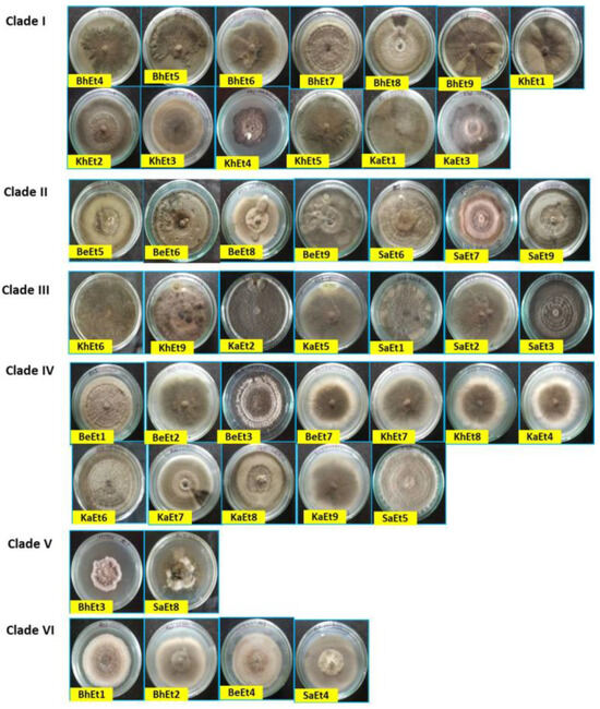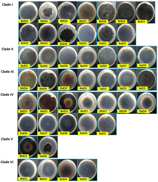 The colony colors varied from olivaceous brown to a whitish black color. Based on the colony color, all 45 isolates were grouped into four categories, i.e., (i) olivaceous brown (BhEt2, BhEt4, BeEt2, BeEt4, BeEt5, BeEt8, KhEt2, KhEt5, KhEt7, KhEt8, KaEt1, KaEt3, KaEt8, KaEt9, SaEt3, and SaEt9), (ii) blackish brown (BhEt1, BeEt3, SaEt4, and SaEt5), (iii) whitish black (BhEt3, BhEt5, BhEt6, BhEt7, BhEt8, BeEt1, KhEt6, KaEt2, and KaEt5), and (iv) grayish (BhEt9, BeEt6, BeEt7, BeEt9, KhEt1, KhEt3, KhEt4, KhEt9, KaEt4, KaEt6, KaEt7, SaEt1, SaEt2, SaEt6, SaEt7, and SaEt8) (Figure 1 and Figure 2, Table 1).