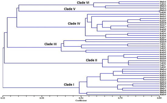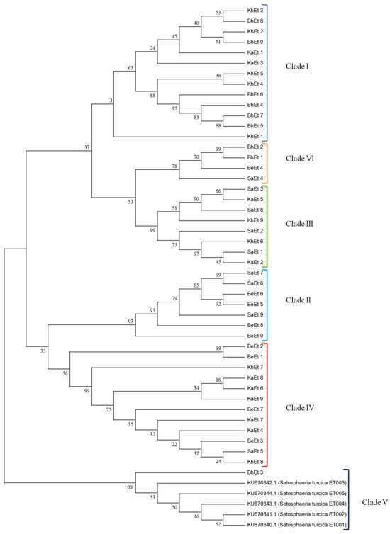 On the basis of morphological and cultural characterization, all the E. turcicum isolates were classified into six clades using their similarity coefficients (Figure 4). The isolates BhEt4, BhEt5, BhEt6, BhEt7, BhEt8, BhEt9, KhEt1, KhEt2, KhEt3, KhEt4, KhEt5, KaEt1, and KaEt3 came under clade I; the isolates BeEt5, BeEt6, BeEt8, BeEt9 SaEt6, SaEt7, and SaEt9 came under clade II; the isolates KhEt6, KhEt9, KaEt2, KaEt5, SaEt1, SaEt2, and SaEt3 came under clade III; the isolates BeEt1, BeEt2, BeEt3, BeEt7, KhEt7, KhEt8, KaEt4, KaEt6, KaEt7, KaEt8, KaEt9, and SaEt5 came under clade IV; the isolates BhEt3 and SaEt8 came under clade V; and the isolates BhEt1, BhEt2, BeEt4, and SaEt4 came under clade VI (Figure 4).