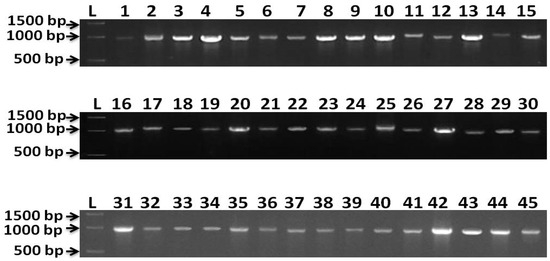Representative bands of PCR product from β-tubulin gene. Amplification fragment size 1000 base pairs (bp). L = 1kb ladder, 1 = BhEt1, 2 = BhEt2, 3 = BhEt3, 4 = BhEt4, 5 = BhEt5, 6 = BhEt6, 7 = BhEt7, 8 = BhEt8, 9 = BhEt9, 10 = BeEt1, 11 = BeEt2, 12 = BeEt3, 13 = BeEt4, 14 = BeEt5, 15 = BeEt6, 16 = BeEt7, 17 = BeEt8, 18 = BeEt9, 19 = KhEt1, 20 = KhEt2, 21 = KhEt3, 22 = KhEt4, 23 = KhEt5, 24 = KhEt6, 25 = KhEt7, 26 = KhEt8, 27 = KhEt9, 28 = KaEt1, 29 = KaEt2, 30 = KaEt3, 31 = KaEt4, 32 = KaEt5, 33 = KaEt6, 34 = KaEt7, 35 = KaEt8, 36 = KaEt9, 37 = SaEt1, 38 = SaEt2, 39 = SaEt3, 40 = SaEt4, 41 = SaEt5, 42 = SaEt6, 43 = SaEt7, 44 = SaEt8, 45 = SaEt9.
