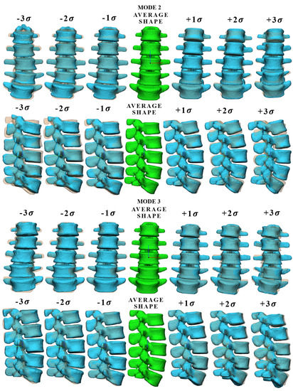Graphic representation of vertebral body for shape mode 2 and mode 3 at different values of , where each deformed shape mode was overlapped with the mean shape (transparent shape below).