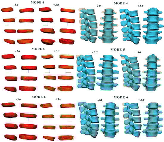Graphic representation of the vertebral body and intervertebral disc for shape mode 4, 5, 6 at different values of , where each deformed shape mode was overlapped with the mean shape (transparent shape below).