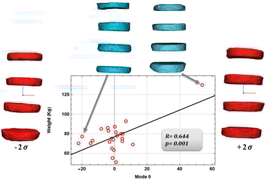 Finally, Pearson correlations were found between the Shape Modes, and anatomical and physiological characteristics. Several authors have made SSM models of the spine considering, for example, healthy patients, but also spine deformities. Dai, J. [28] and Yong, R. [29], and their collaborators, limited their work to just the variation of the spinal geometry and deformity, they have not actually considered, as we have with our work, the possible correlations that we have found between the shape modes and the anatomical and pathological features. Once, we found significant Pearson correlations between mode 6 and Cobb’s angle, mode 10 and mean column width for the vertebral body; for the intervertebral disc, a positive correlation was found between mode 9 and patient weight. These correlations represent the actual link between the shape modes and the anatomical and pathological characteristics of the anatomical region in question.